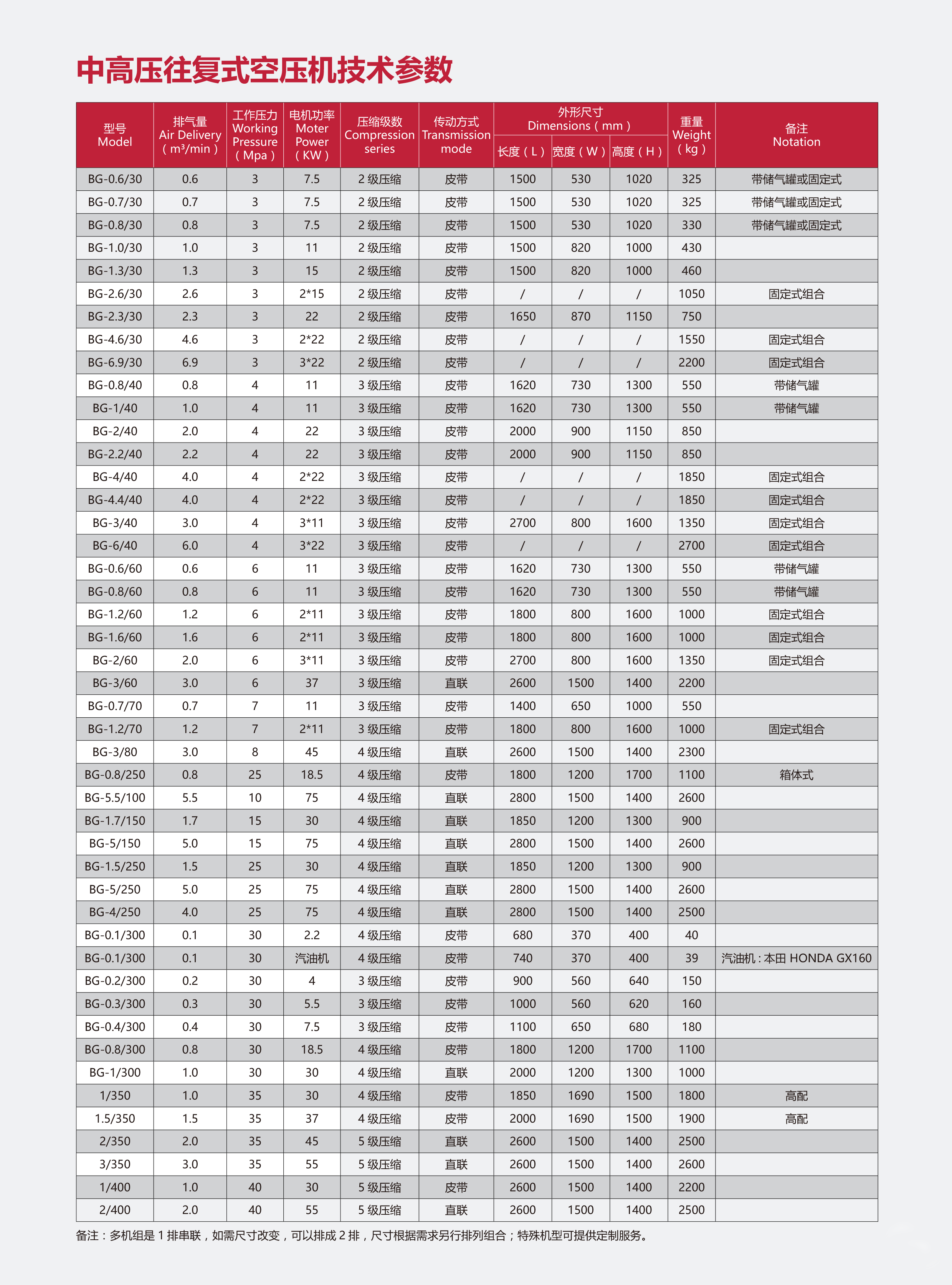BG series air compressor is mainly used in pipeline pressure test, pressure test and pressure test in oil exploitation